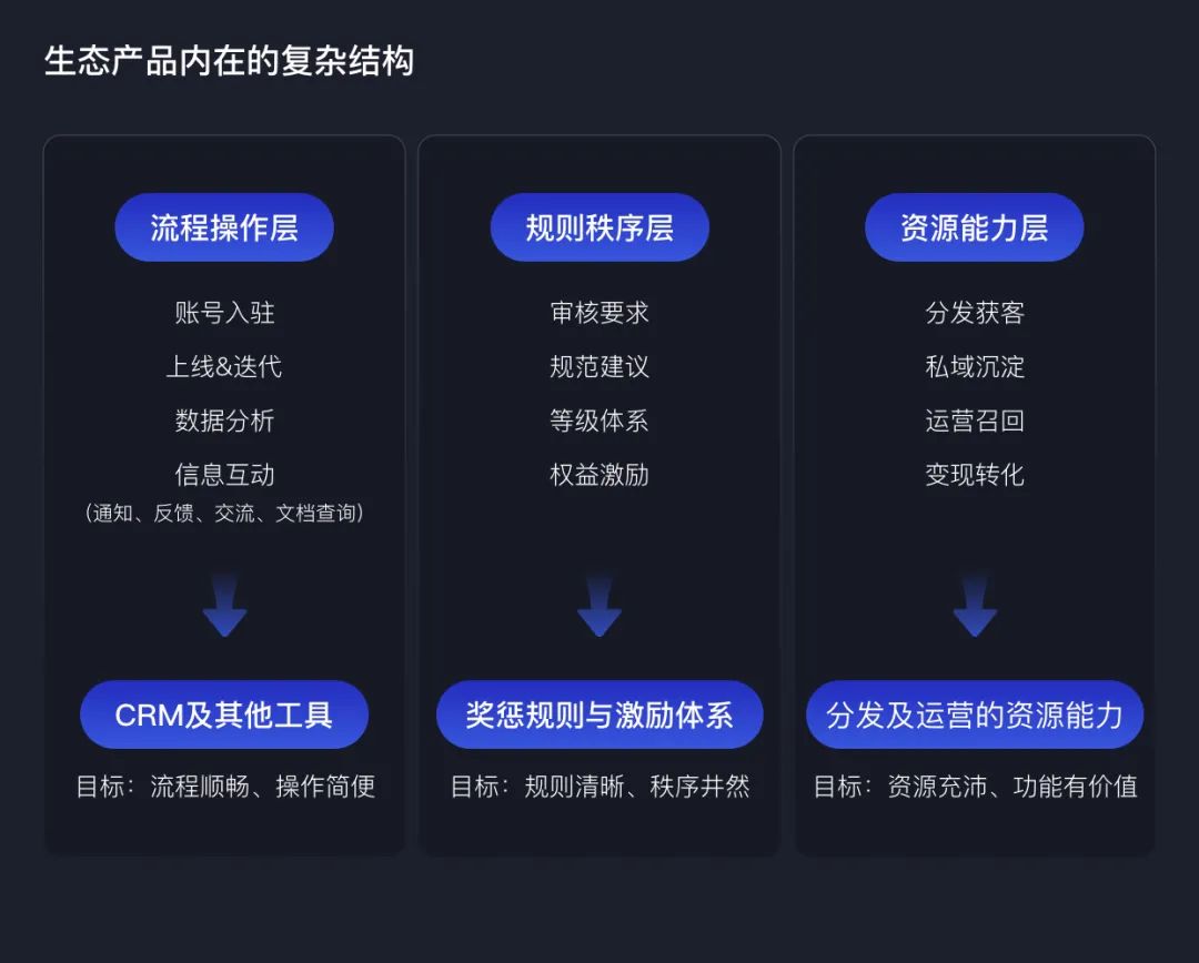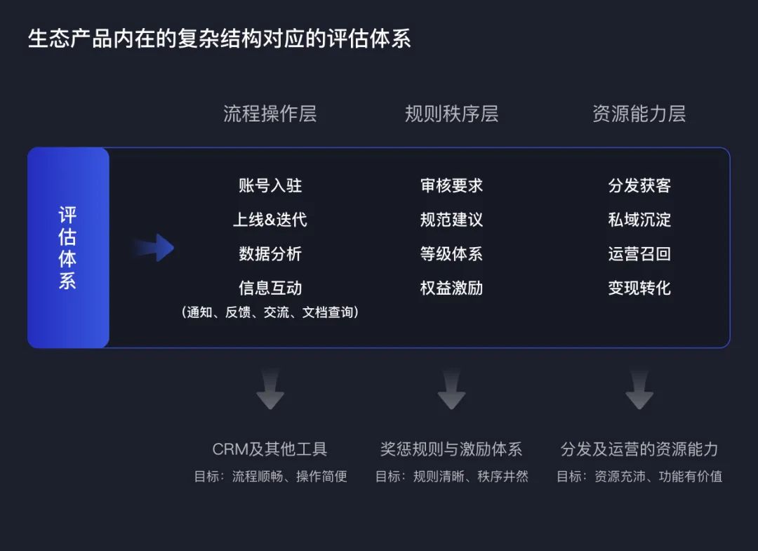 这种评估的衡量主体不再是我们熟悉的C端用户产品,衡量范畴也不应仅局限在功能易用、体验流畅等传统用户产品体验维度上;而是转化到平台与B端的生态视角,分析内容或服务供给者与分发平台之间合作流程、合作意愿,以及分发平台的生态健康度。