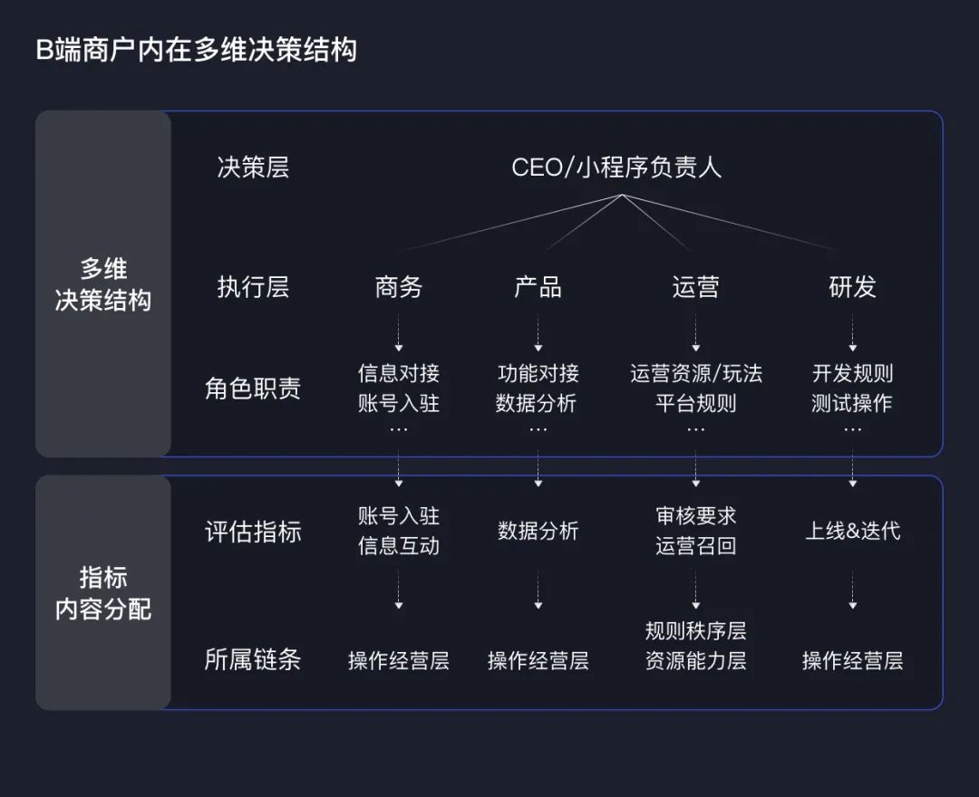 由于评估主体是商户,不像传统C端用户是“决策”与“执行”的统一体,商户内部存在决策层(CEO/小程序负责人)和执行层(商务、产品、运营、研发等)的角色分离,导致不同角色能贡献的信息并不相同。