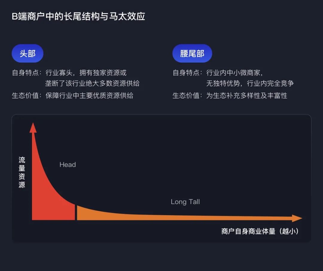 虽然长尾商户个体对平台价值贡献很少,但群体数量巨大,种类繁多,可保障平台供给的多样性,满足用户多元长尾的需求,因此也是生态中必不可少的供给者。