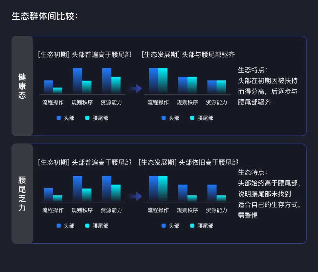 而如果腰尾部得分持续低迷,则说明平台后续的发展潜力不足。同样,如果头部从始至终都没有腰尾部得分高,说明示范作用没树立起来,优质资源有流失的风险。这两种都是生态健康度不佳的表现,需要业务加强警惕。