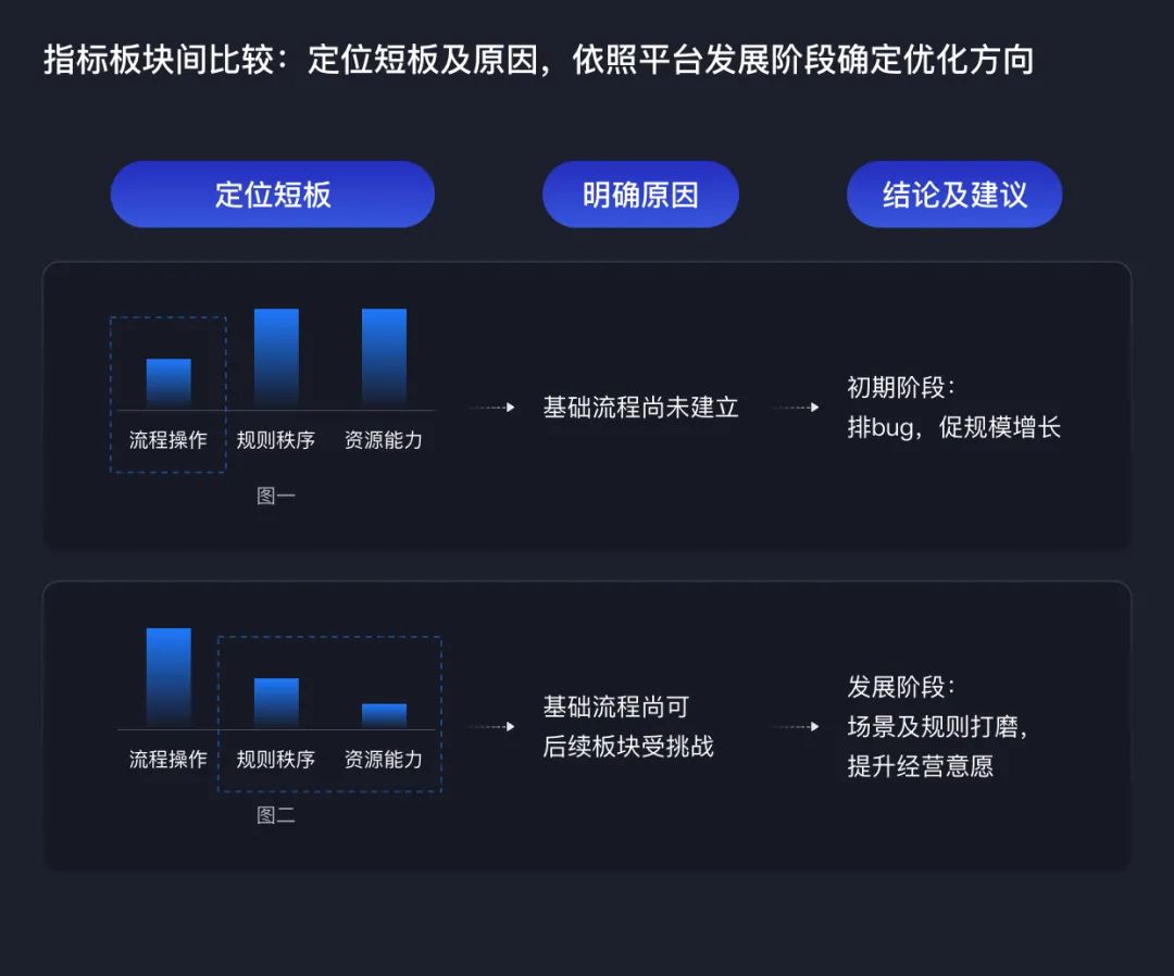在不同发展阶段,平台生态建设的目标重点也不同。通过横向对比各指标差异,能够判断出现阶段短板问题,确定后续优化方向。