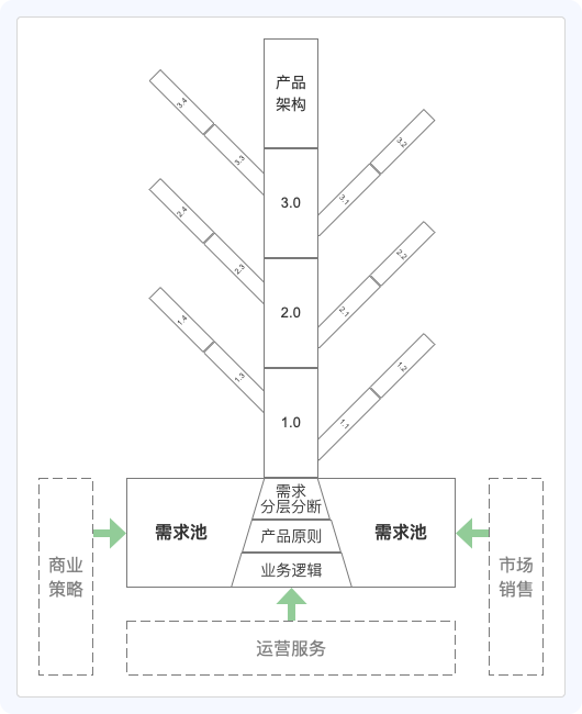 借鉴《需求池和版本树,相生相持,铺垫产品成就参天大树》中的模型进行改造升级,如图: