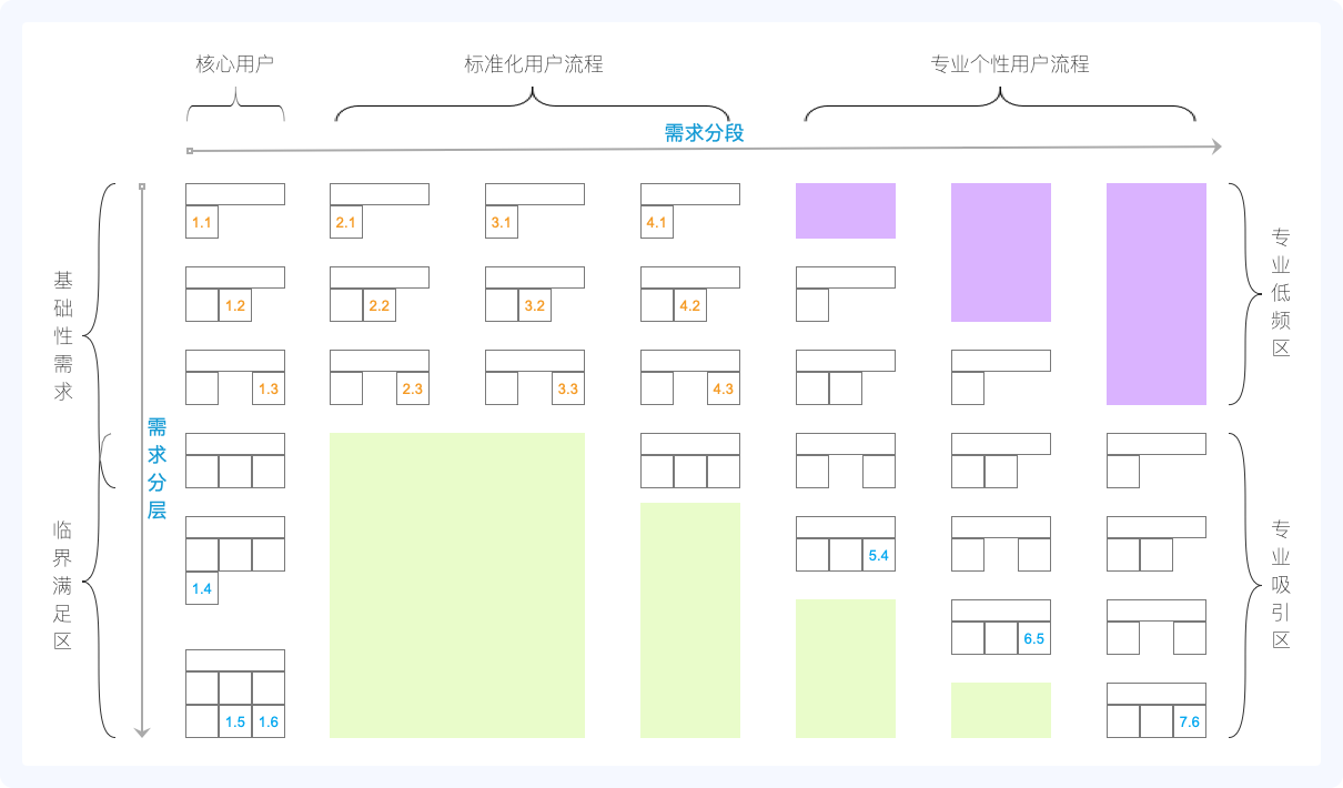 基于基础需求、差异需求与标准用户与个性用户的二维度划分四个区域:基础性需求、临界满足区、专业低频区、专业吸引区。